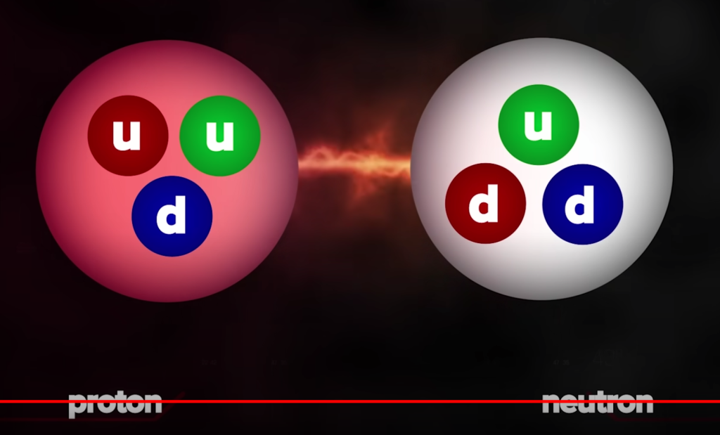 Namun, konfigurasi tiga quark proton & neutron berbeda. Proton dibentuk dari dua u-quark & satu d-quark. Sedangkan neutron itu kebalikannya, dibentuk dari dua d-quark & satu u-quark. Satu u-quark bermuatan 2/3, sedengan satu d-quark -1/3. Perbedaan muatan u-quark & d-quark menyebabkan proton bermuatan positif (1) & neutron tidak bermuatan / netral (0).