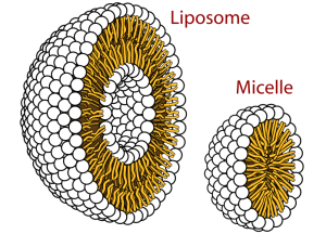 Konfigurasi lain yang mungkin dari lipid adalah seperti micelle di gambar di atas. Namun, kalau seperti itu, tentu tidak akan ada air di dalam micelle tersebut. Membran sel bisa dibilang seperti liposome di atas, karena bisa ada ruang di dalamnya. Tentu saja, ukuran sebuah sel jauh lebih besar dari liposome di atas.