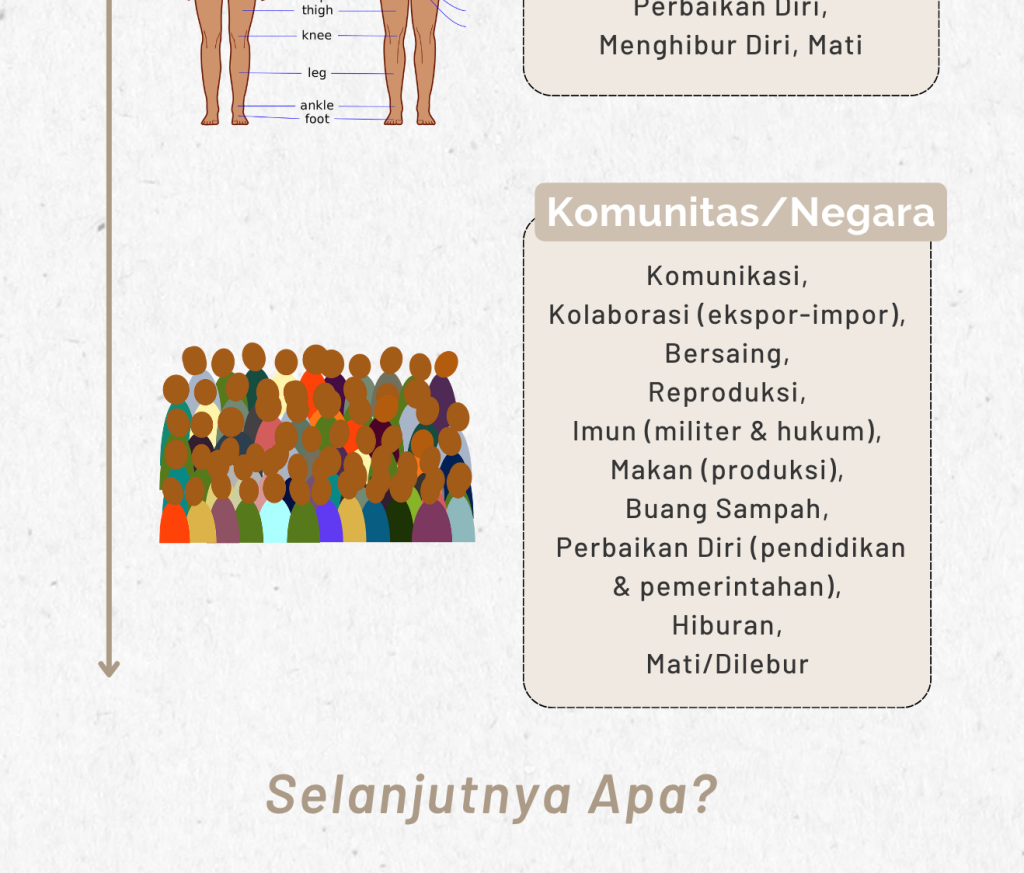 - Komunitas/negara di sana hanyalah salah satu contoh sesuatu yang lebih kompleks dari individu. Contoh lain adalah perusahaan. Perusahaan juga mengulangi banyak pola-pola sebelumnya: memproduksi sesuatu barang/jasa; berkolaborasi dengan partner/pelanggan; membuang limbah produksi; memonitor & memperbaiki berjalannya perusahaan; bangkrut/dibeli perusahaan lain. Dengan begini, seorang manusia mungkin adalah ‘keberadaan’ pertama yang bisa hidup di beberapa sistem yang lebih kompleks (keluarga, perusahaan, tetangga, negara) secara sekaligus.